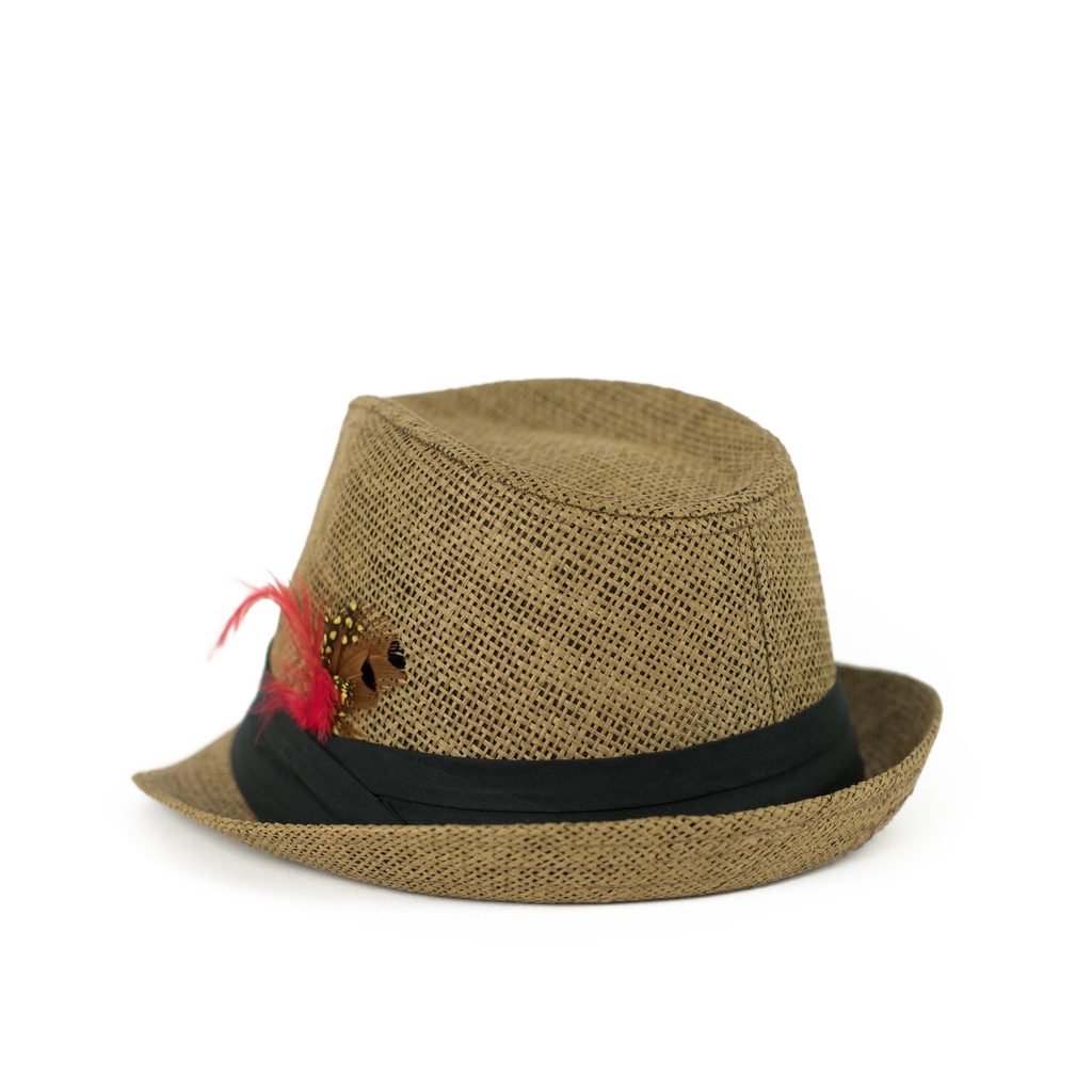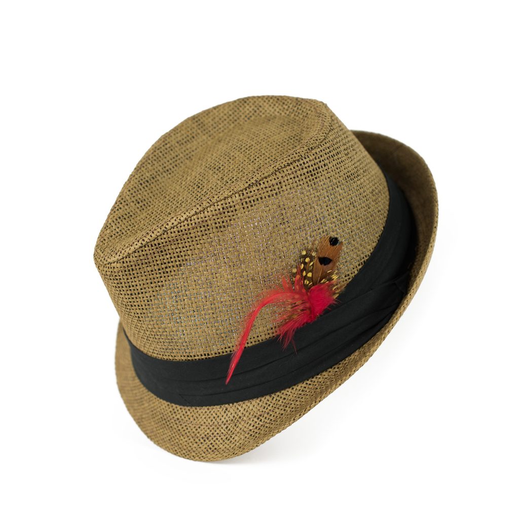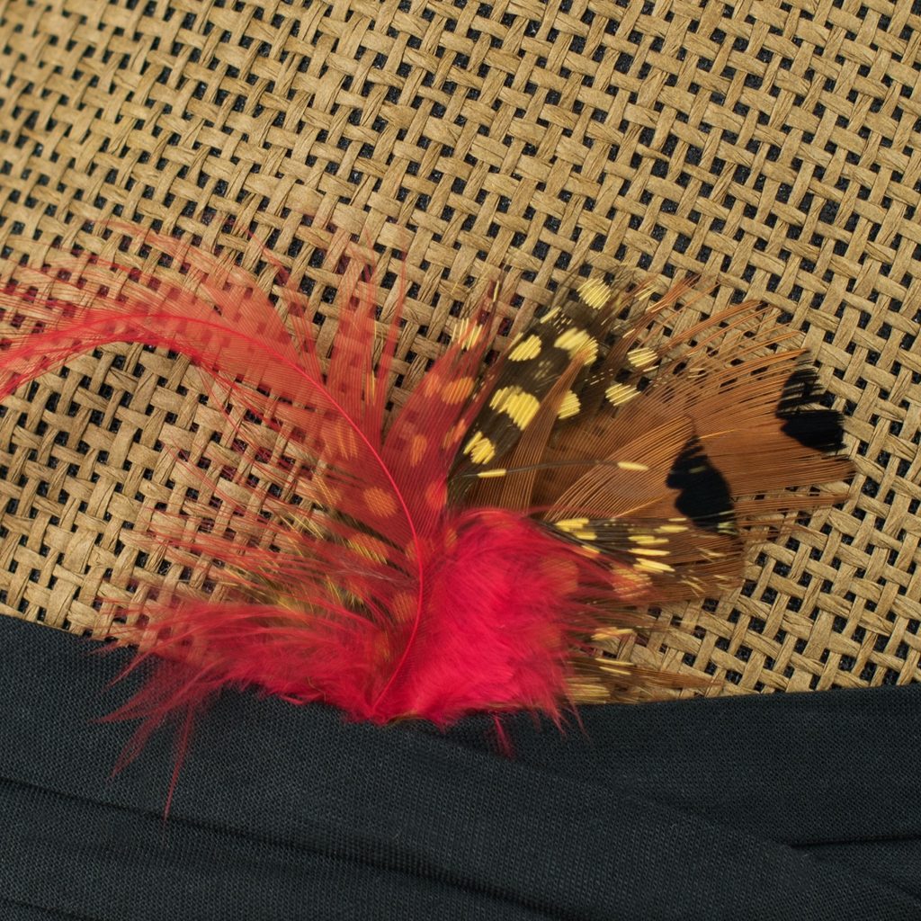 Letní klobouk typu trilby. Provedený z přírodního materiálu. Velmi lehký, hezky se prezentuje na hlavě. Unisex. Výrobek dekorovaný pírky.