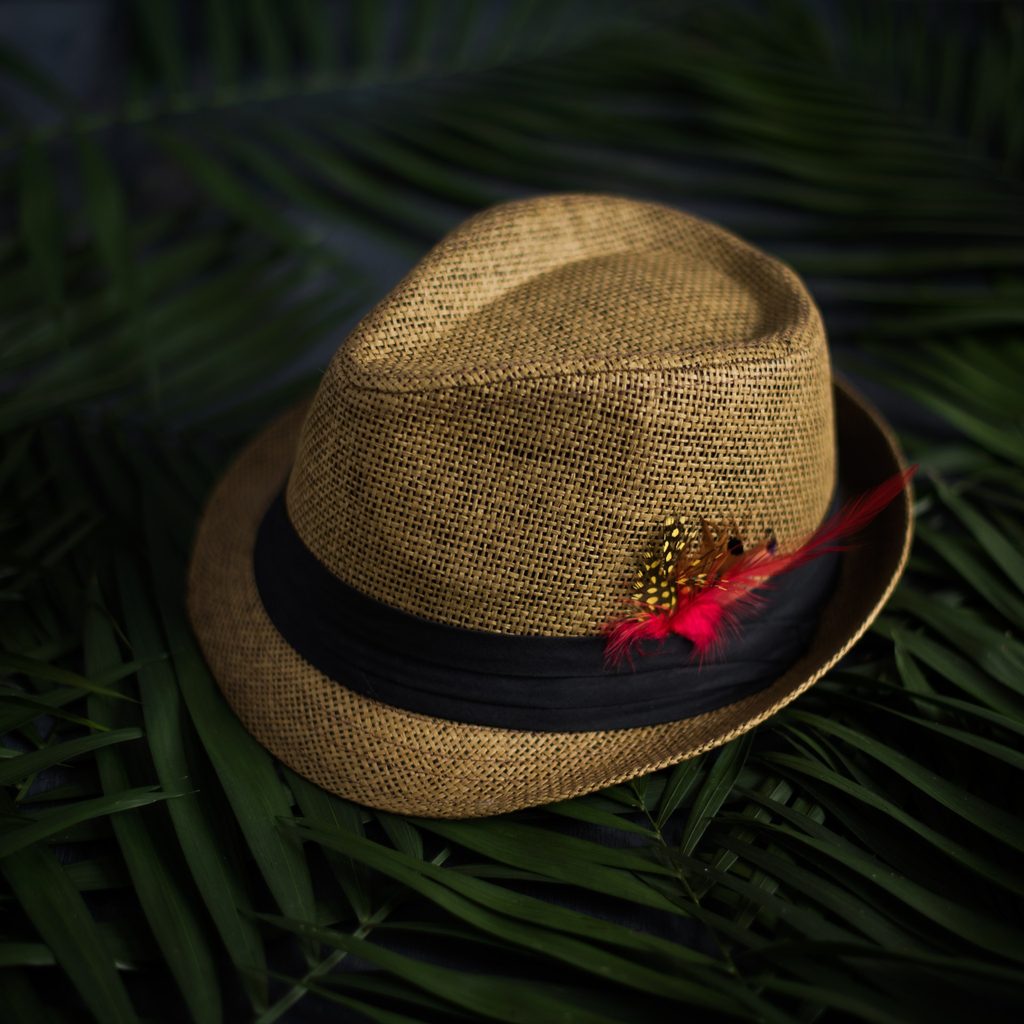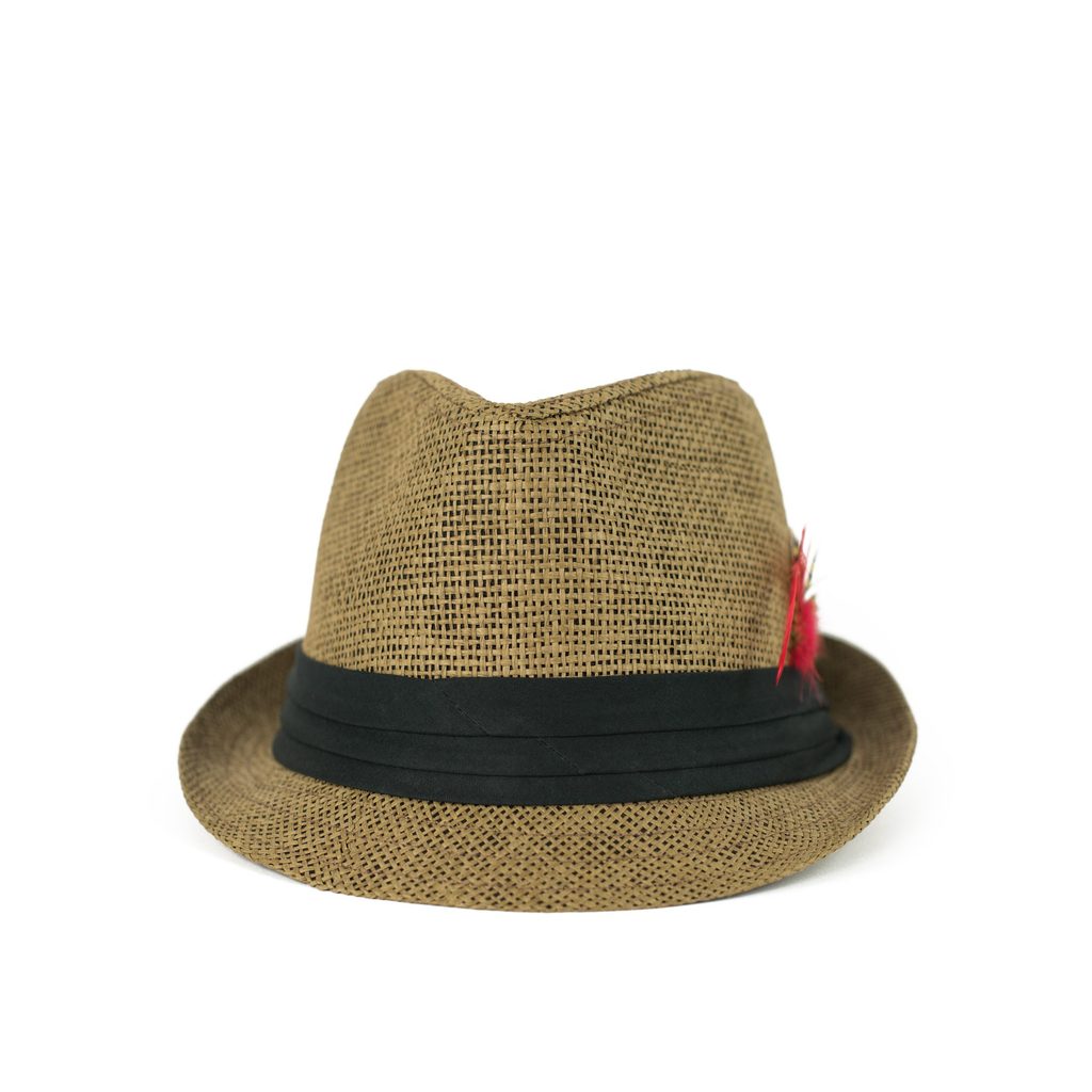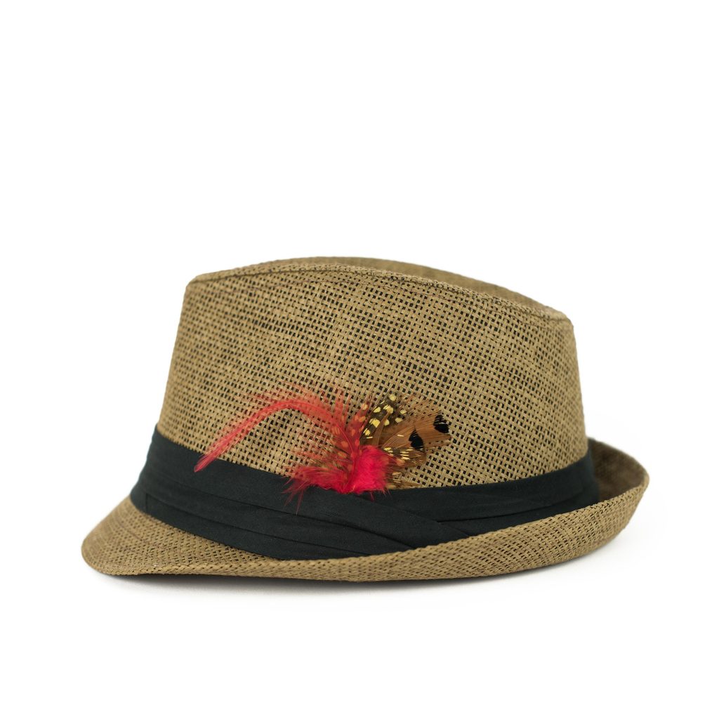 Letní klobouk typu trilby. Provedený z přírodního materiálu. Velmi lehký, hezky se prezentuje na hlavě. Unisex. Výrobek dekorovaný pírky.