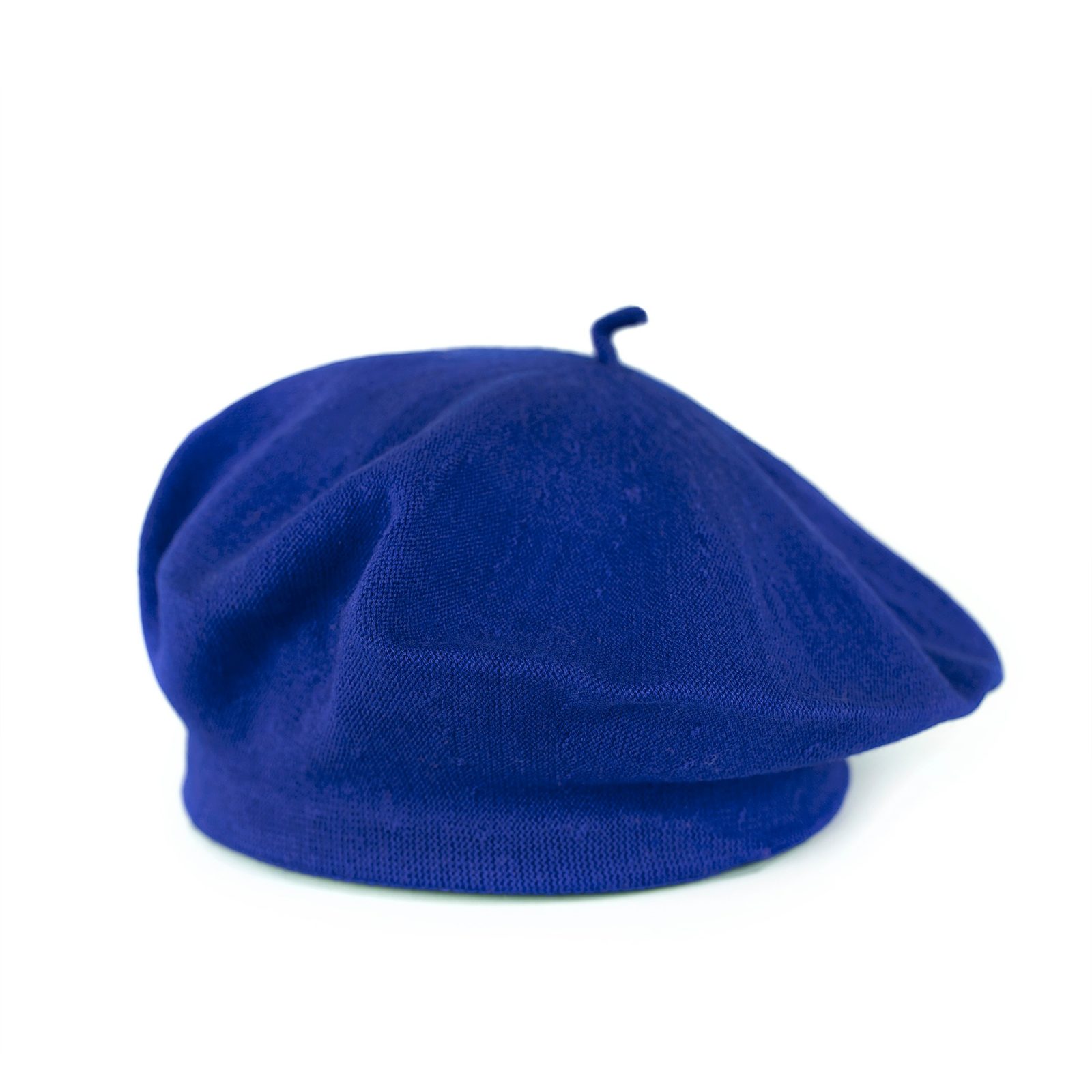 Baret s proužky modrý Melanžová čepice s třemi bambulkami hořčicová