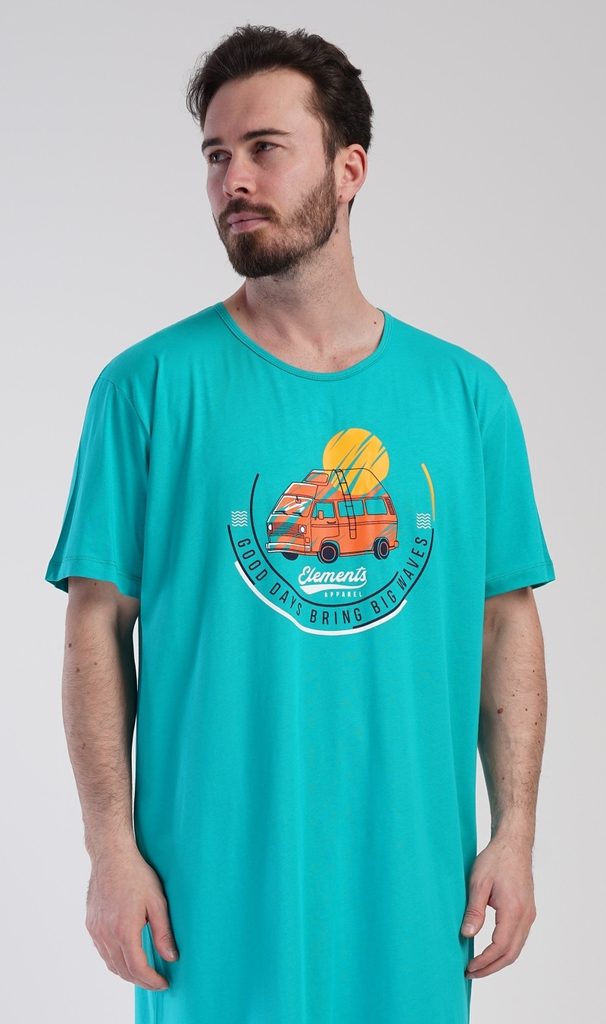 Pánská bavlněná noční košile s krátkým rukávem Adventure. Jednobarevná pánská noční košile s kulatým výstřihem a délkou po kolena má na hrudi obrázek obytného vozu a nápis 'Good days bring big waves'. Noční košile je vhodným dárkem pro všechny milovníky cestování. Použitý materiál s obsahem bavlny 100% je příjemný a poddajný na dotek.