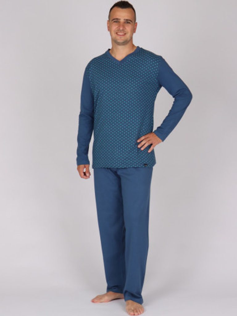 Pohodlné pánské pyžamo z čisté bavlny je příjemné na tělo. Pyžamo se skládá z trika a kalhot s dlouhou nohavicí. Je ideální na chladnější roční období.