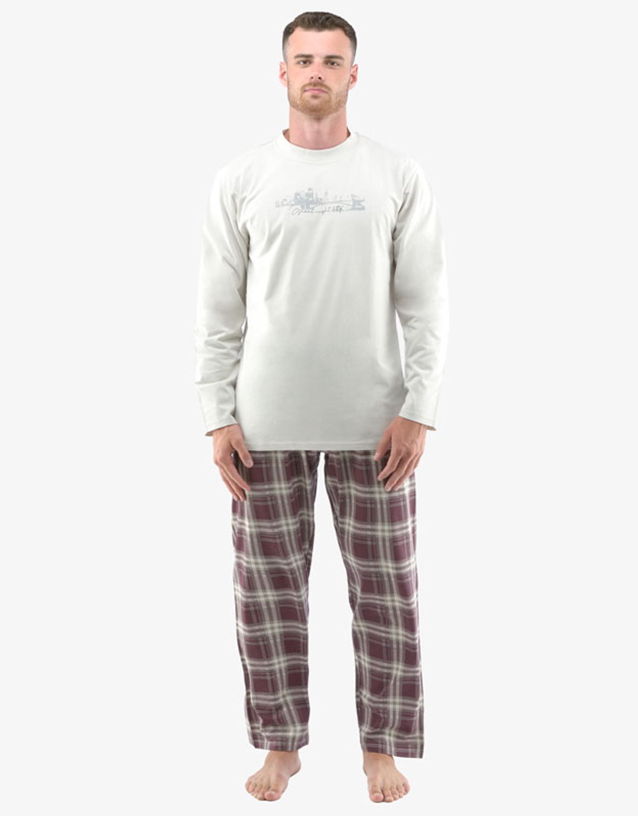 Základem kvalitního spánku je vaše pohodlí, ke kterému vám pomůže i pohodlné noční prádlo. Triko s dlouhým rukávem má na hrudi potisk a na dlouhé kalhoty jsme zvolili jednoduchý kárový vzor. Bavlněný úplet je ideální volbou materiálu pro noční prádlo a potěší hlavně příznivce přírodních materiálů. Budete se v něm cítit doslova jako v bavlnce.. Kolekce: Pyžama 2022