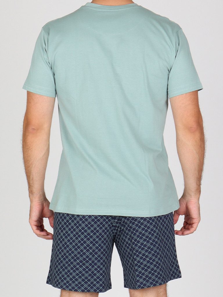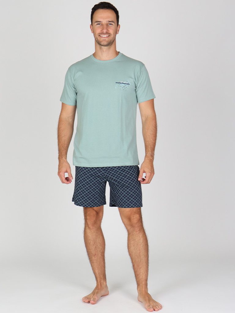 Pohodlné bavlněné pánské krátké pyžamo se skládá z jednobarevného trika s drobným potiskem a krátkých kalhot.