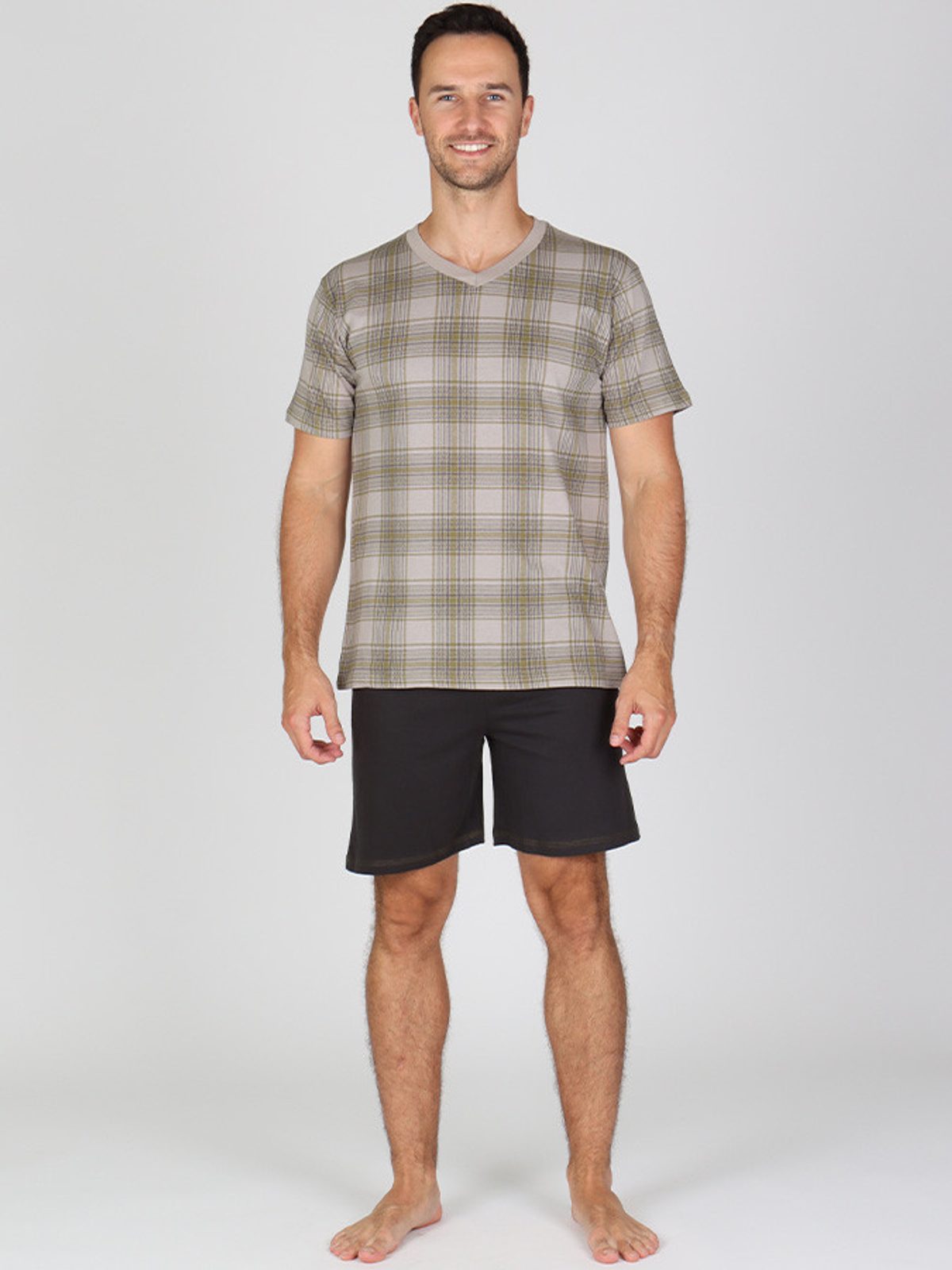 Pohodlné bavlněné pánské krátké pyžamo se skládá z trika s celoplošným potiskem a z jednobarevných krátkých kalhot.