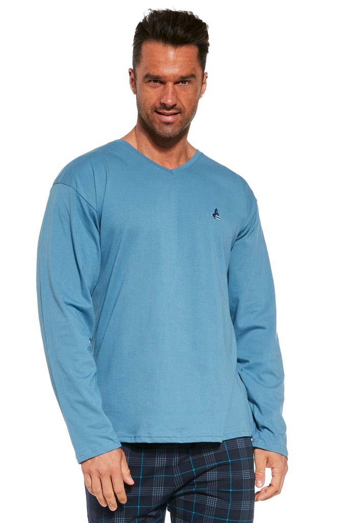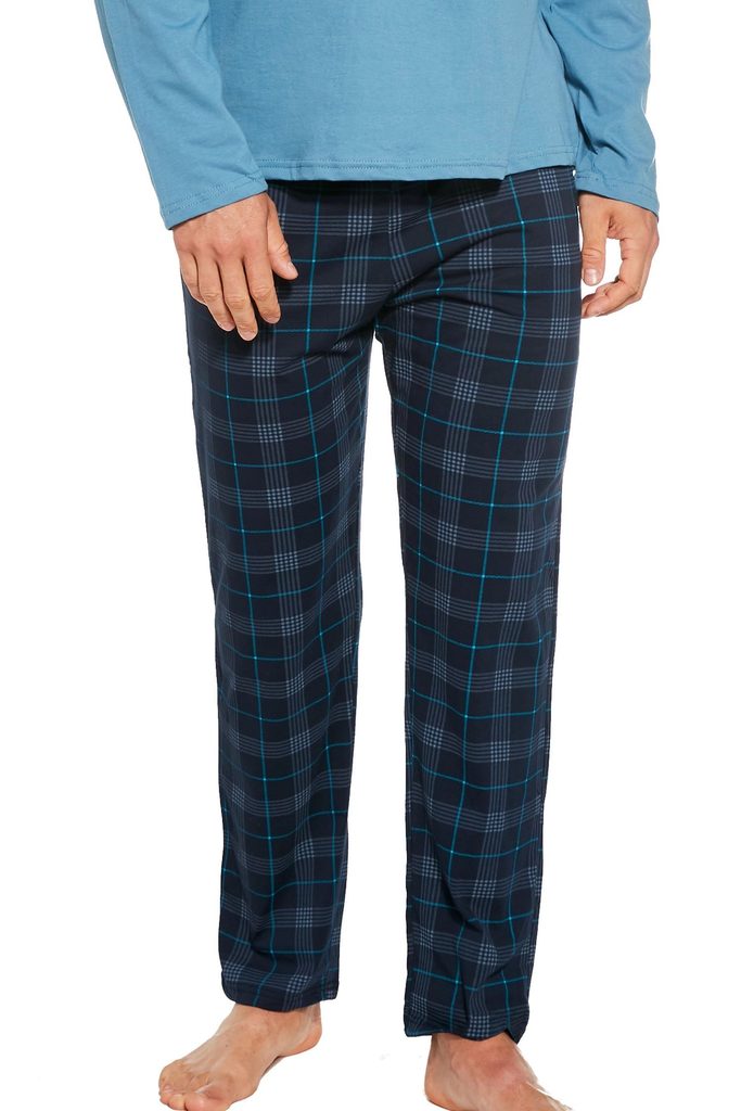 Pánské pyžamo 124/240 Derby CORNETTE - je vyrobené z velmi kvalitní bavlny - světle modré tričko s dlouhými rukávy - ozdobené potiskem - pohodlné dlouhé kárované kalhoty
