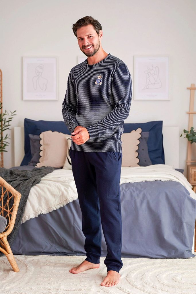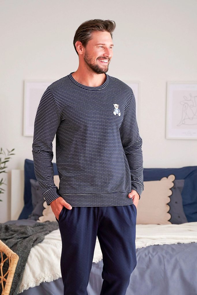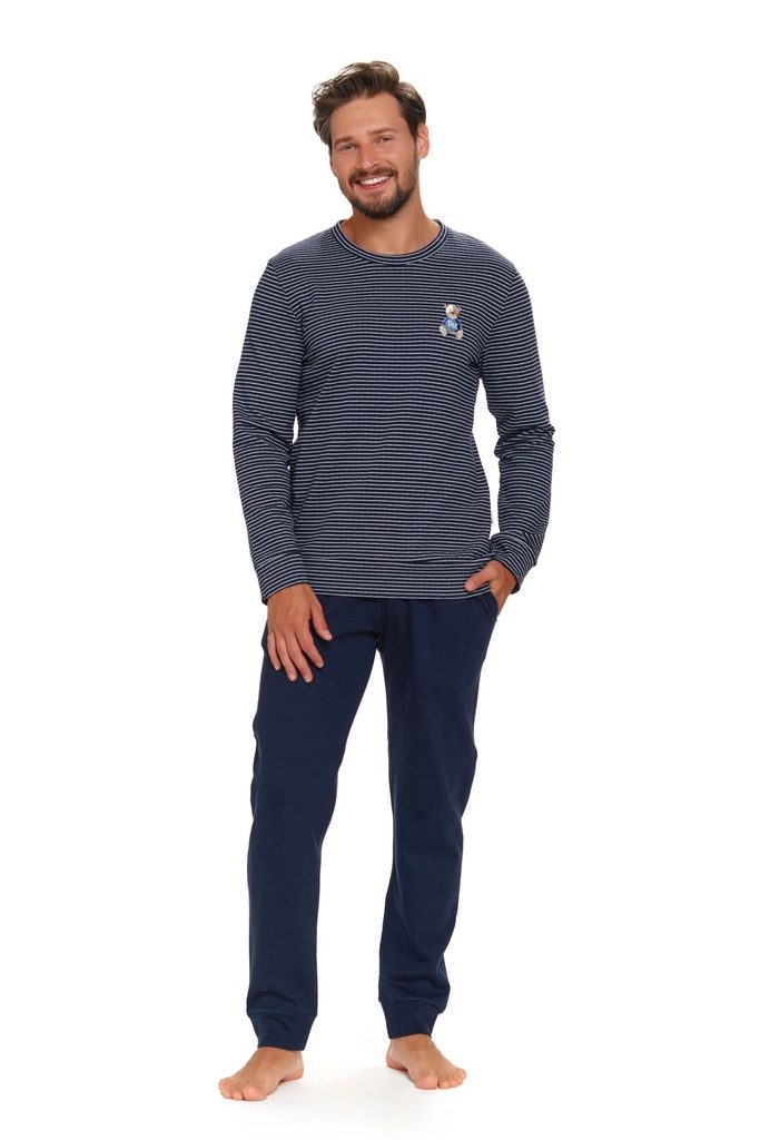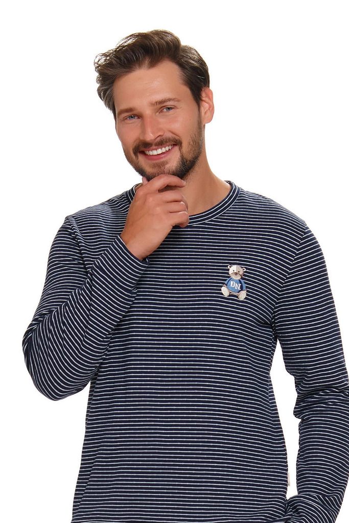 Pánské pyžamo 5251 plus Doctornap - vyrobené z velmi kvalitní a příjemné proužkované bavlny - tmavě modré tričko s dlouhými rukávy - ozdobené proužky a potiskem - dlouhé tmavé kalhoty s kapsami - certifikát OEKO-TEX Standard 100