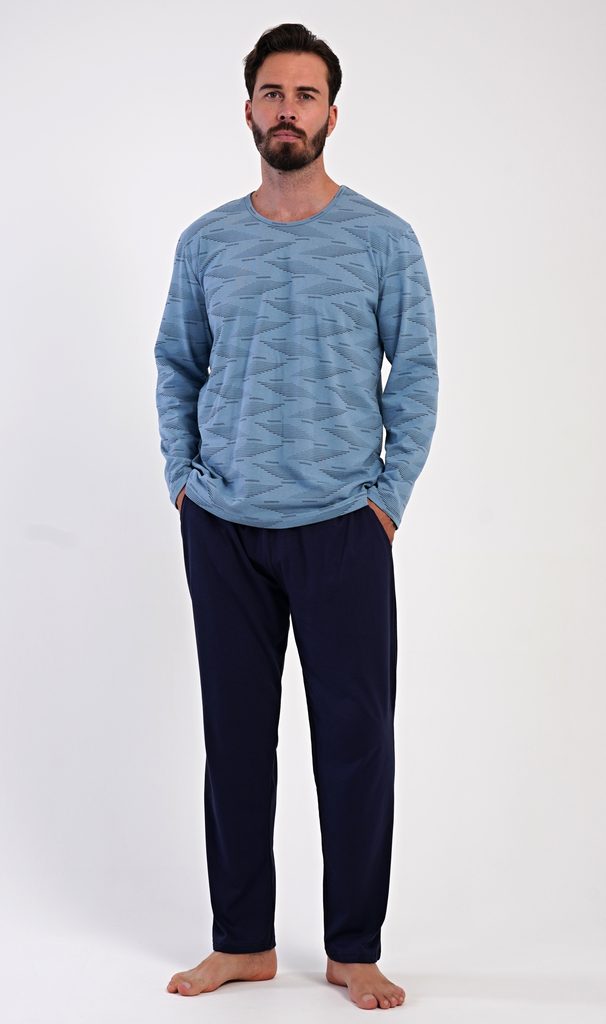 Pánské dlouhé bavlněné pyžamo Arnošt. Pánské pyžamo se skládá z trika s dlouhým rukávem a dlouhých kalhot. Triko s kulatým výstřihem je potištěno geometrickým vzorem. Jednobarevné kalhoty mají v pase gumu, šňůrku na stažení a praktické kapsy. Použitý materiál s obsahem bavlny 100% je poddajný a příjemný na dotek.