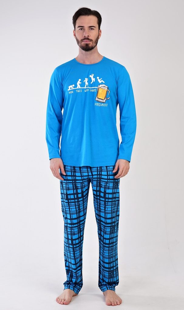 Pánské bavlněné pyžamo dlouhé Filip. Pánské pyžamo se skládá z trika s dlouhým rukávem a dlouhých kalhot. Jednobarevné triko s kulatým výstřihem je zdobeno veselým obrázkem panáčků, kteří se s blížícím víkendem nemůžou dočkat sklenice piva. Kostkované kalhoty mají v pase gumu a šňůrku na stažení. Nemají kapsy. Použitý materiál je příjemný a poddajný na dotek. Podíl bavlny u kalhot i trika je 100%.