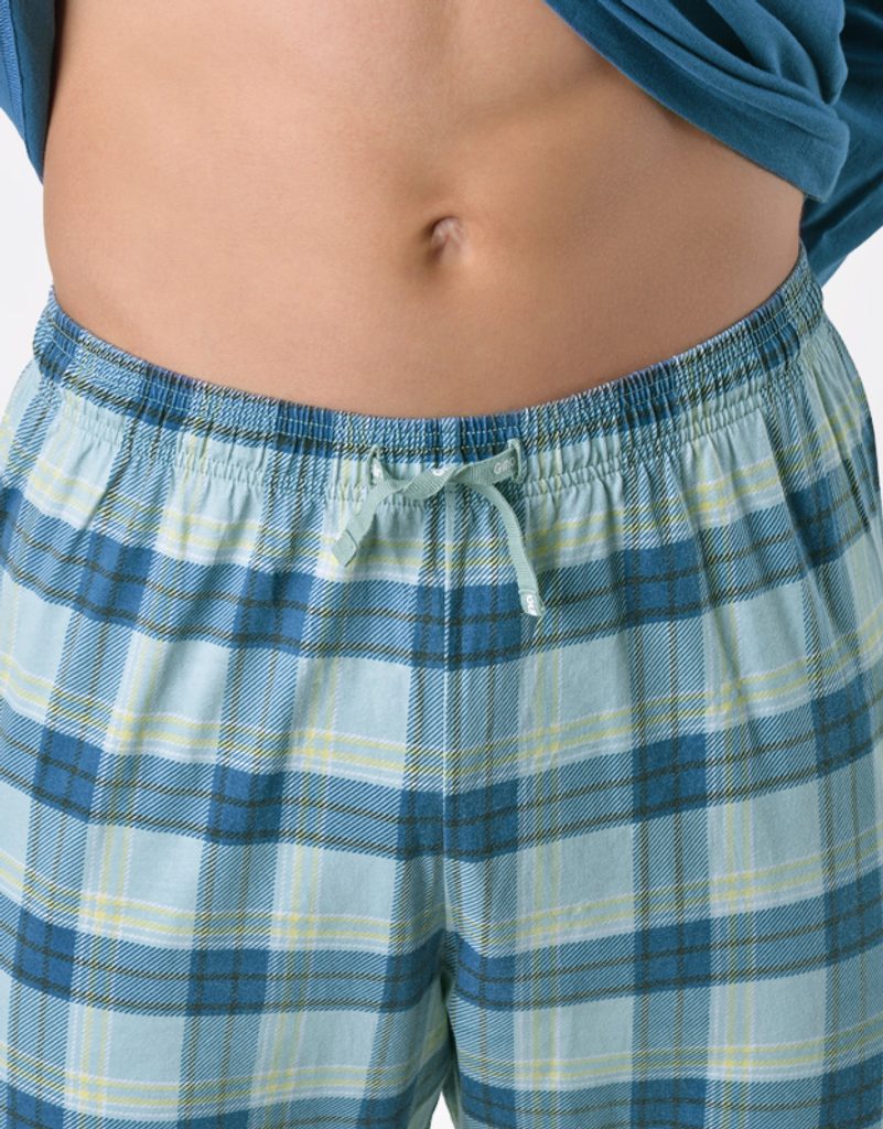 Pánské klasické pyžamo volného střihu z jemného úpletu Vám poskytne pohodlí během spánku. Kalhoty s oblíbeným vzorem káro doplňuje jednobarevné triko s dlouhými rukávy.