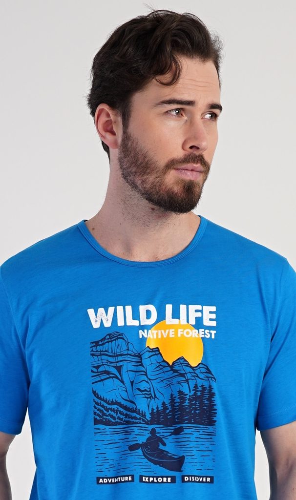 Pánské bavlněné kapri pyžamo Wild life. Pánské pyžamo se skládá z trička s krátkým rukávem a tříčtvrtečních kalhot. Jednobarevné tričko s kulatým výstřihem má na hrudi obrázek horského jezera a drobný nápis 'Wild life'. Tričko vhodně doplňují kárované kalhoty pod kolena, které mají v pase gumu, šňůrku na stažení a kapsy. Použitý materál s obsahem bavlny 100% je příjemný a poddajný na dotek.