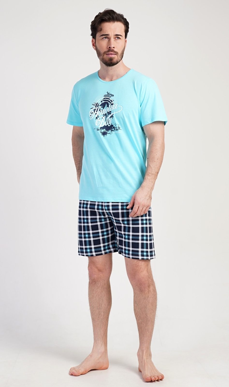 Pánské bavlněné pyžamo šortky Honolua bay. Pánské pyžamo se skládá z trička s krátkým rukávem a krátkých šortkových kalhot. Na tričku je obrázek malého ostrova a nápis 'Honolua bay'. Tričko doplňují kárované šortky, které mají v pase gumu a šňůrku na stažení, nemají kapsy. Použitý materiál s obsahem bavlny 100% je příjemný a poddajný na dotek.