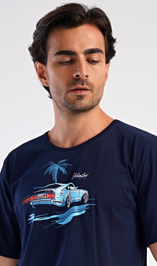 Pánské bavlněné šortkové pyžamo Jonáš. Pánské pyžamo se skládá z trička s krátkým rukávem a krátkých šortkových kalhot. Na tričku je obrázek sportovního auta a nápis 'Unlimited'. Tričko doplňují jednobarevné šortky, které mají v pase gumu, šňůrku na stažení a praktické kapsy. Použitý materiál s obsahem bavlny 100% je příjemný a poddajný na dotek.