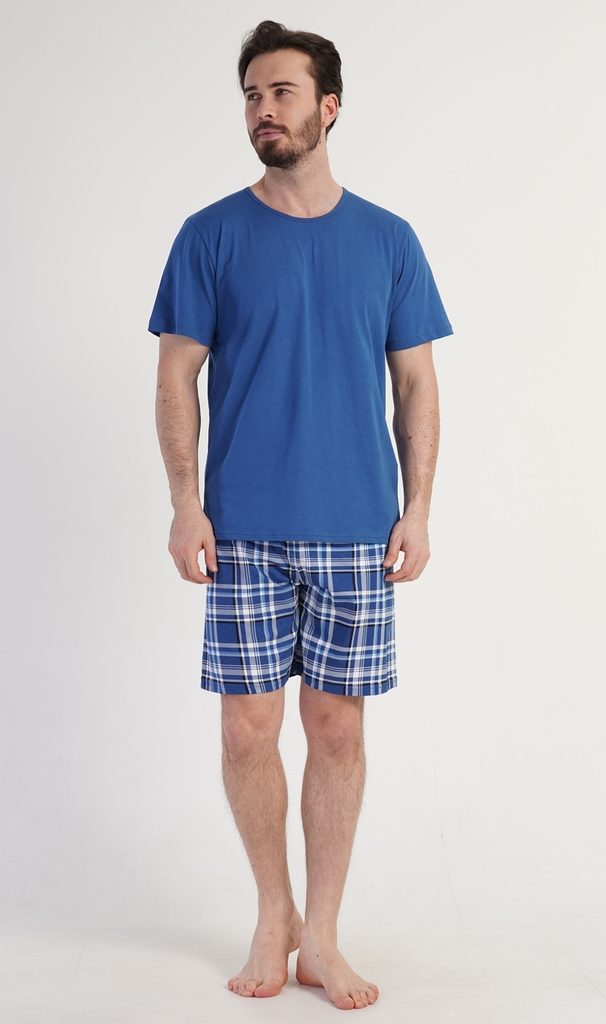 Pánské bavlněné šortkové pyžamo Motocycle. Pánské pyžamo se skládá z trička s krátkým rukávem a krátkých šortkových kalhot. Tričko má na zádech obrázek motocyklu a nápis 'Motor life'. Tričko doplňují kárované šortky, které mají v pase gumu a šňůrku na stažení, nemají kapsy. Použitý materiál s obsahem bavlny 100% je příjemný a poddajný na dotek.