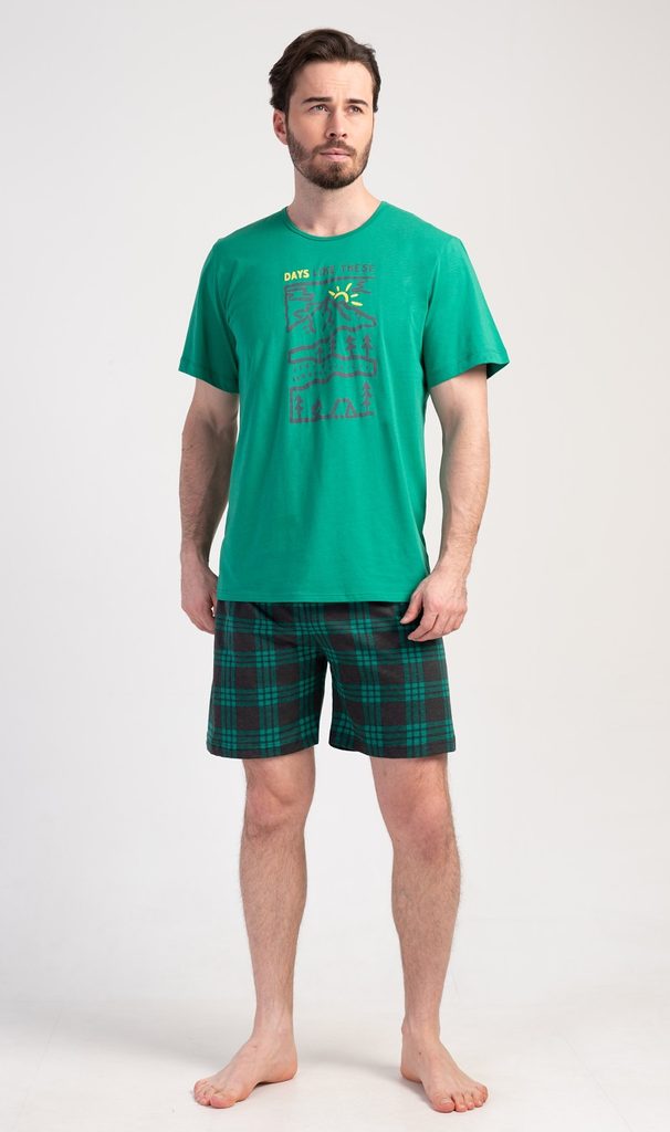 Pánské bavlněné pyžamo šortky Outdoor. Pánské pyžamo se skládá z trička s krátkým rukávem a krátkých šortkových kalhot. Na tričku je obrázek lesnaté krajiny a nápis 'Days like these'. Tričko doplňují kárované šortky, které mají v pase gumu a šňůrku na stažení, nemají kapsy. Použitý materiál s obsahem bavlny 100% je příjemný a poddajný na dotek.