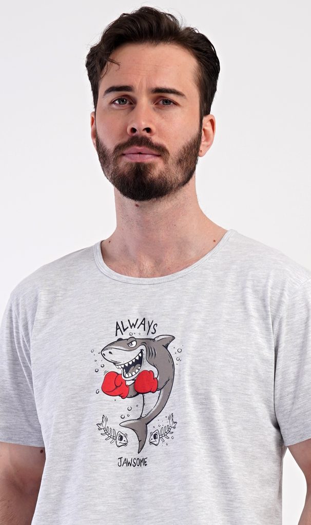 Pánské šortkové pyžamo Žralok. Pánské pyžamo se skládá z trička s krátkým rukávem a krátkých šortkových kalhot. Na tričku je obrázek žraloka. Šortky mají kapsy, v pase gumu a šňůrku na stáhnutí. Použitý materiál je příjemný a poddaný na dotek. Obsah bavlny u trička je 70% a u šortek 100%. Pyžamo je vhodné i na denní nošení a oceníte ho obzvlášť v horkých letních dnech.