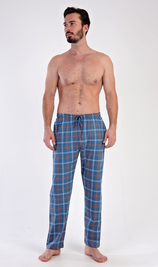Pánské bavlněné pyžamové kalhoty Aleš. Kostkované kalhoty mají v pase gumu, šňůrku na stažení a praktické kapsy. Mateiriál s podílem bavlny 100% je příjemný a poddajný na dotek. Kalhoty jsou vhodné na denní nošení jako domácí kalhoty.