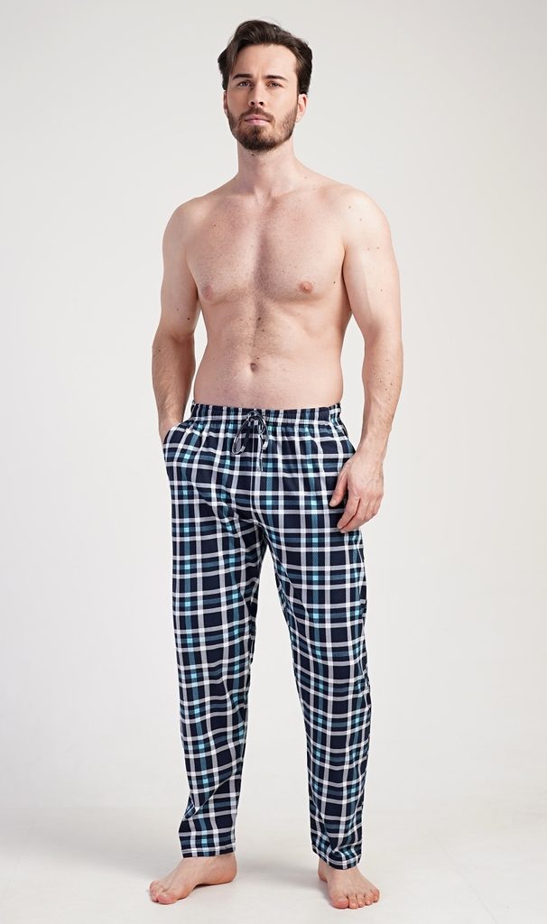 Pánské bavlněné pyžamové kalhoty Simon. Kostkované kalhoty mají v pase gumu, šňůrku na stažení a praktické kapsy. Mateiriál s podílem bavlny 100% je příjemný a poddajný na dotek.