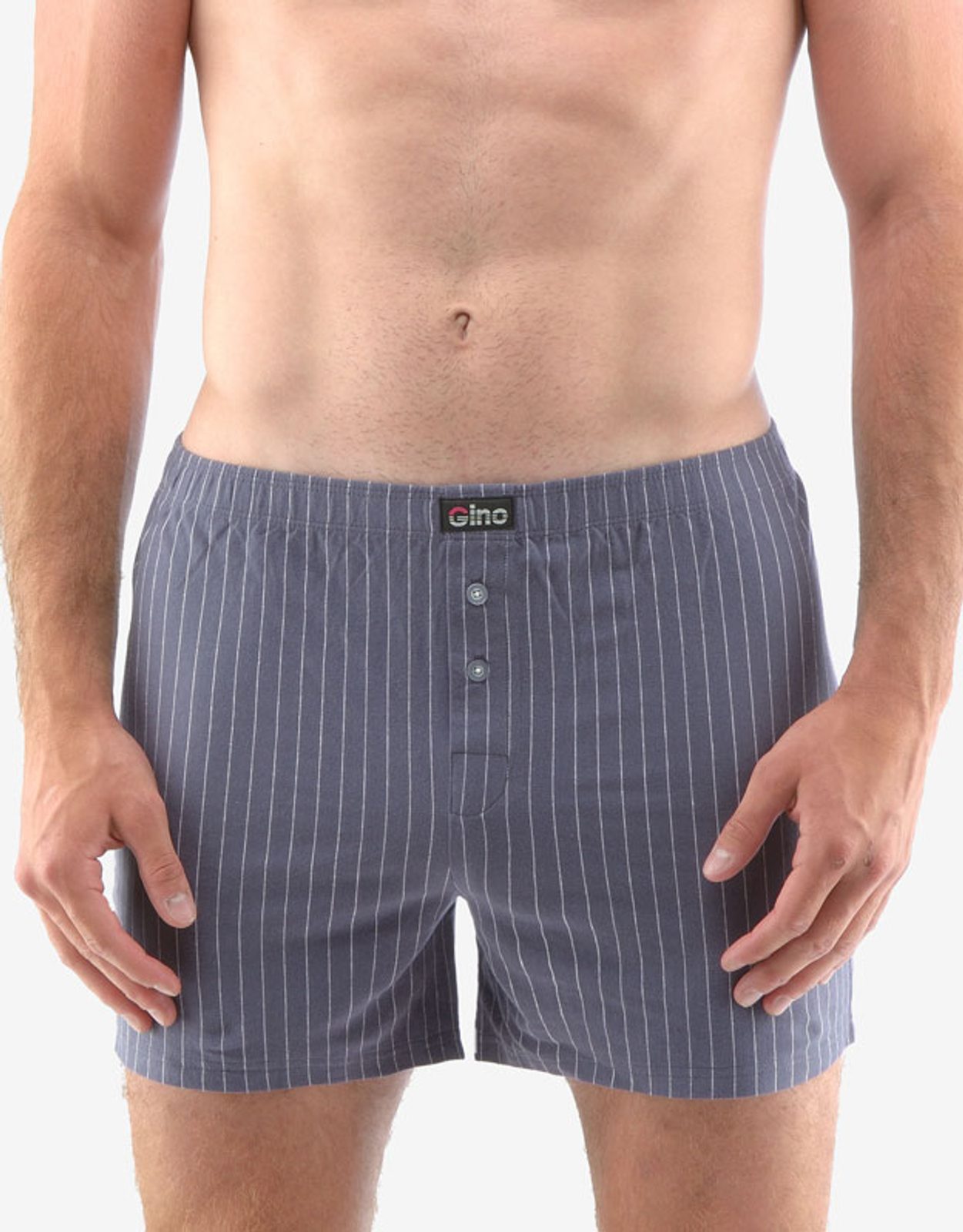 Volné trenky ze 100% bavlny jsou ideální volbou pro každého, kdo má rád klasický pohodlný střih volných trenek a přírodní materiály. Tento kousek má vzor decentních proužků a v pase nášivku s logem Gino. Dobře padnoucí pasová guma a rozparek na dva knoflíky jsou samozřejmostí..