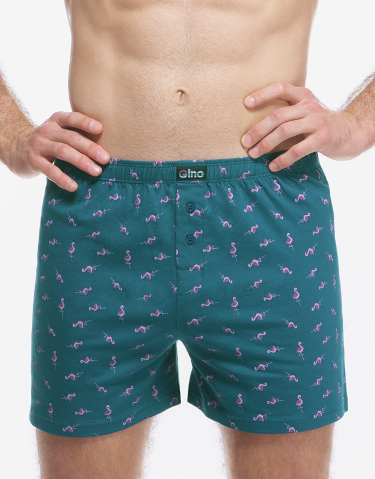 Volné trenky ze 100% potěší každého, kdo má rád klasický pohodlný střih volných trenek a přírodní materiály. Dobře padnoucí pasová guma a rozparek na dva knoflíky jsou samozřejmostí. Tento kousek má celoplošný vzor s motivem plameňáků, v pase nášivku s logem Gino. Trenky jsou vhodné pro každodenní nošení..