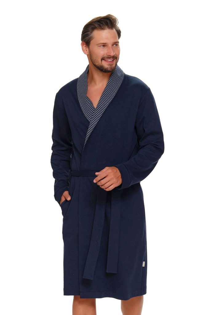 Pánský župan 5283 Doctornap - tmavě modrá barva - vyrobený z velmi kvalitního a příjemného materiálu - s šálovým límcem - s kapsami - vázání v pase - certifikát OEKO-TEX Standart 100