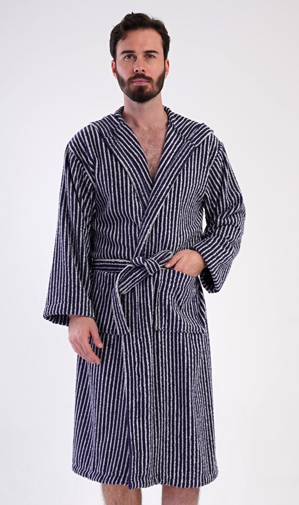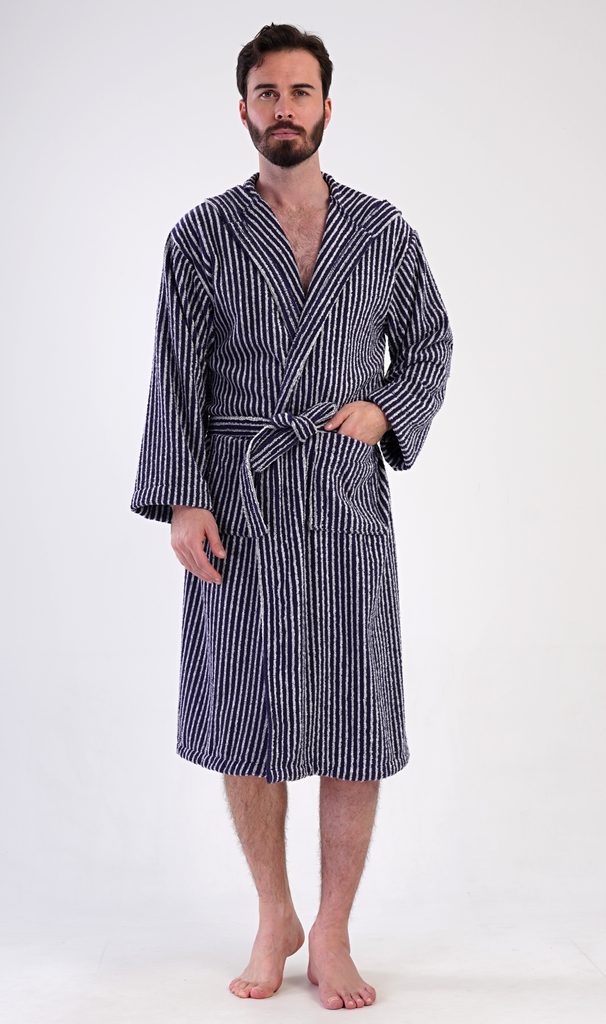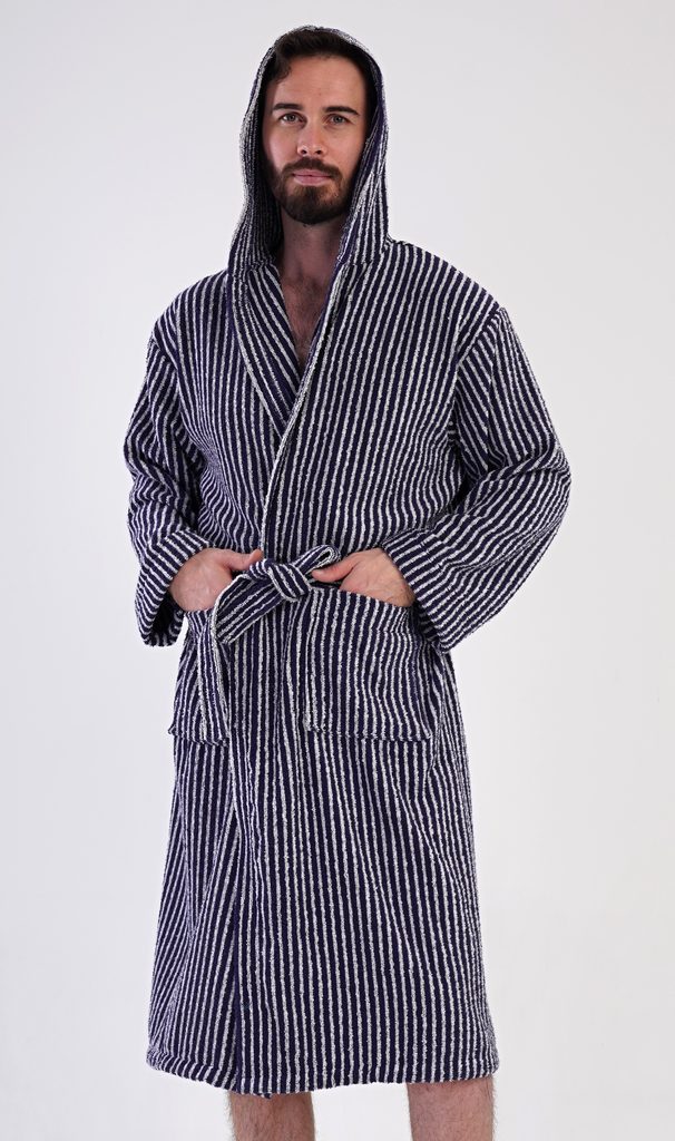 Pánský bavlněný froté župan s kapucí Proužek. Pánský dlouhý župan s kapucí a páskem ke stažení je vhodný po koupeli i na povalování se doma na gauči. Froté župan má praktické kapsy, které oceníte při návštěvě wellness. Použitý bavlněný materiál je příjemný a poddajný na dotek.