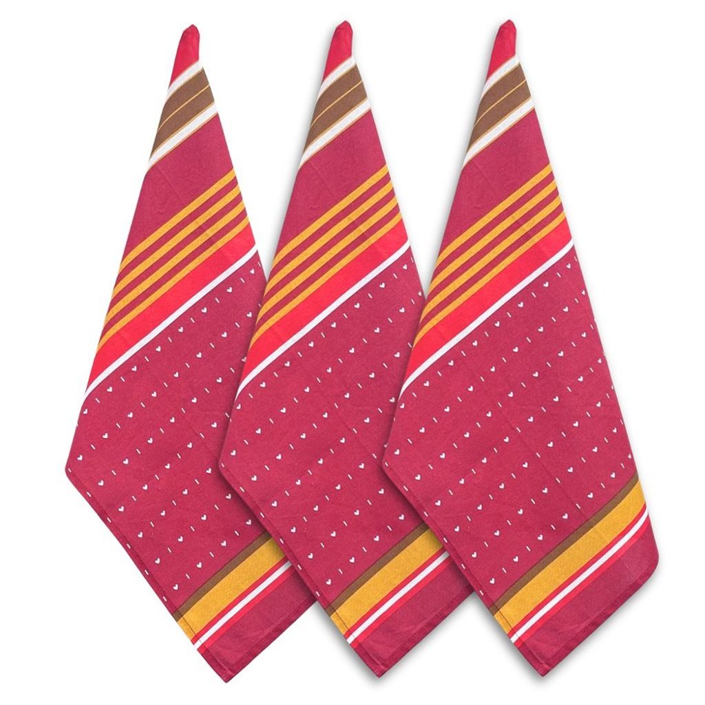 3 kusy bavlněných utěrek na červeném podkladě se zajímavým motivem srdíček a proužků. Kvalitní bavlněná utěrka slouží v kuchyni hlavně na utírání nádobí, příborů a sklenic, aby bylo vše suché a lesklé. Je to nepostradatelný praktický hezký doplněk, ideálně ladící s kuchyňským prostředím a dalším textilem. Potěší i jako dárek.