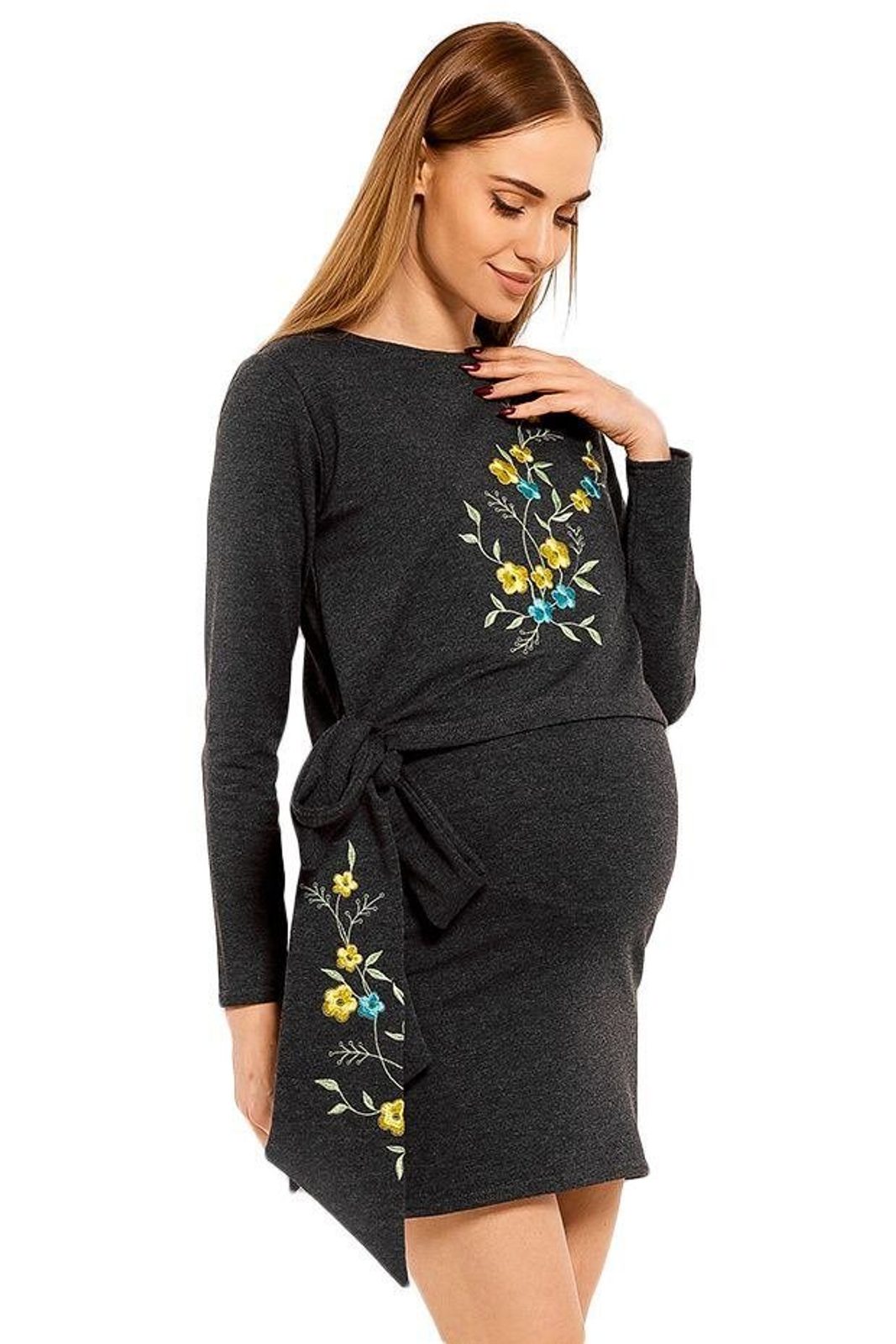 Trendy těhotenské šaty s dlouhým rukávem, v tmavě šedé barvě, doplněné barevnou květinovou výšivkou. Trendy těhotenské šaty s dlouhým rukávem, v tmavě šedé barvě, doplněné barevnou květinovou výšivkou. Materiál: 90% viskóza, 5% elastan, 5% polyamid