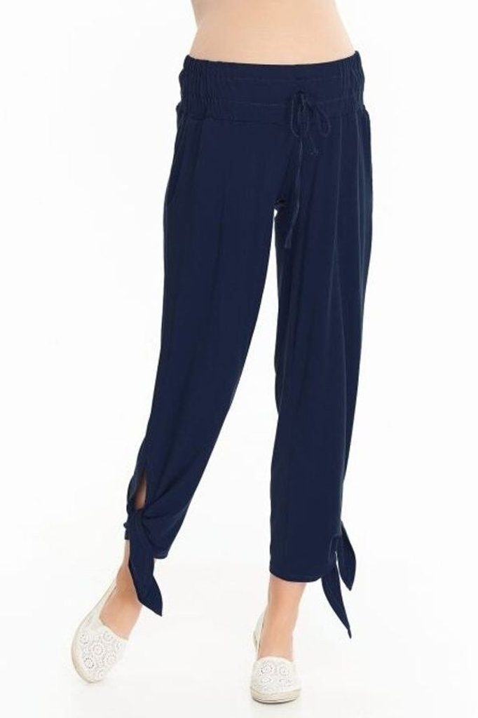 Módní těhotenské kalhoty vyrobené z elastické viskózy v tmavě modré barvě. Módní těhotenské kalhoty vyrobené z elastické viskózy v tmavě modré barvě. Materiál: 94% viskóza, 6% elastan